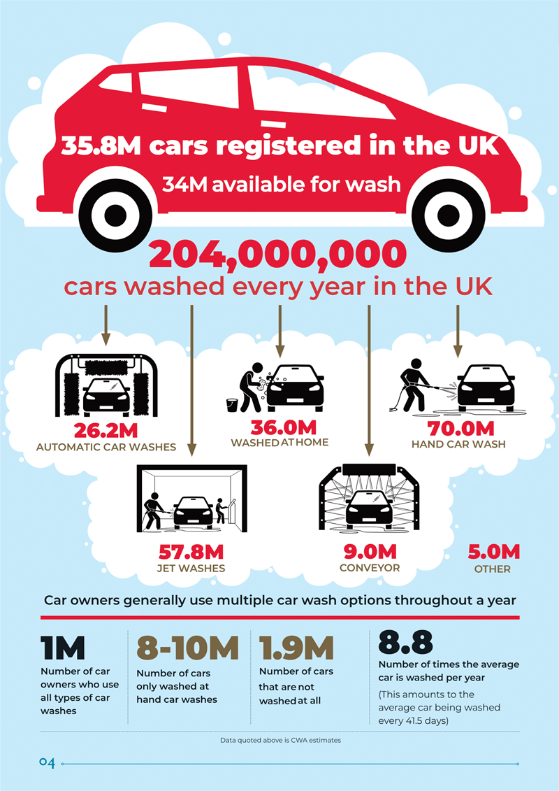 There are currently 35.8 million passenger cars in the UK (source DfT). Washing these generates in excess of £1.0bln in sales.
